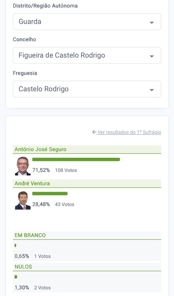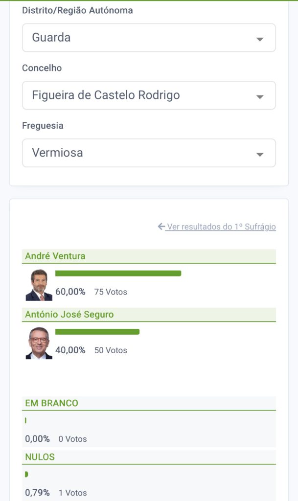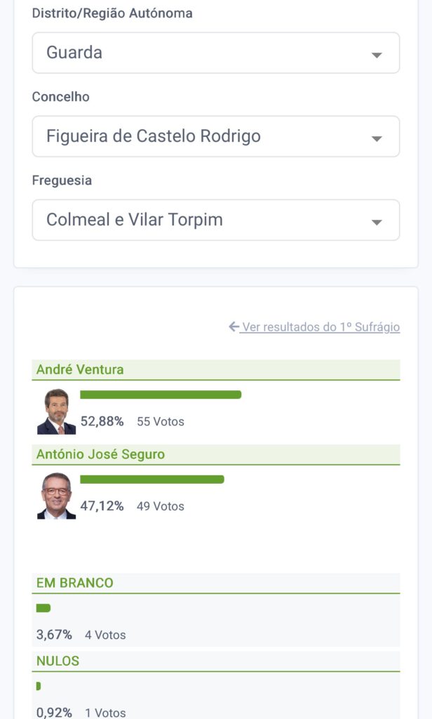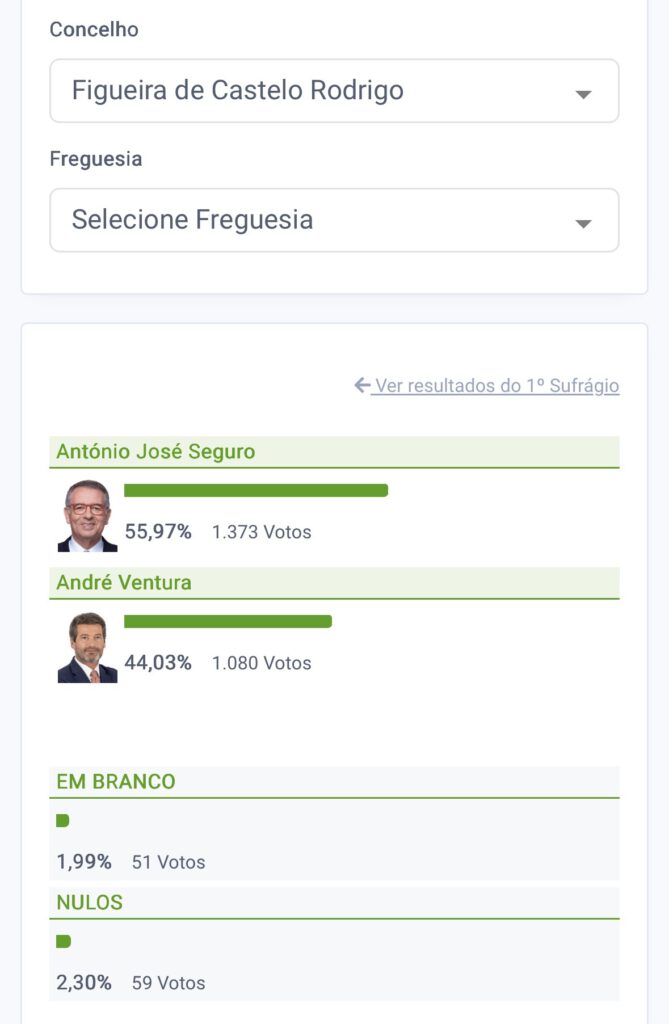 Figueira de Castelo Rodrigo foi o concelho do distrito da Guarda onde António José Seguro obteve a mais baixa votação (55,97%) e em duas das dez freguesias chegou mesmo a ter menos votos do que André Ventura. Um dos casos é a Vermiosa, onde o líder do Chega conseguiu mesmo 60% e Seguro 40%. O outro resultado favorável a Ventura foi na freguesia de Colmeal e Vilar Torpim, onde obteve 52,88% e Seguro 47,12%. Castelo Rodrigo foi, por seu lado, a freguesia daquele concelho onde Seguro conseguiu atingir os 71,52% e Ventura apenas 28,48%.