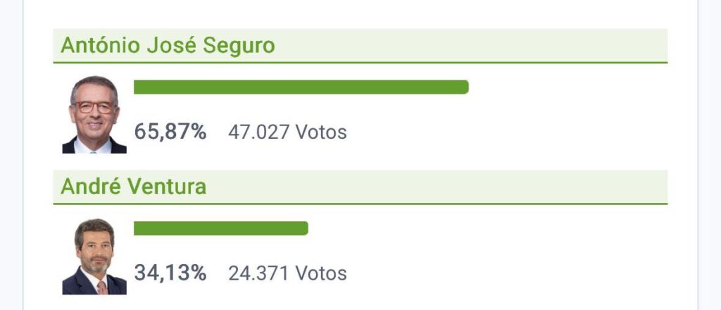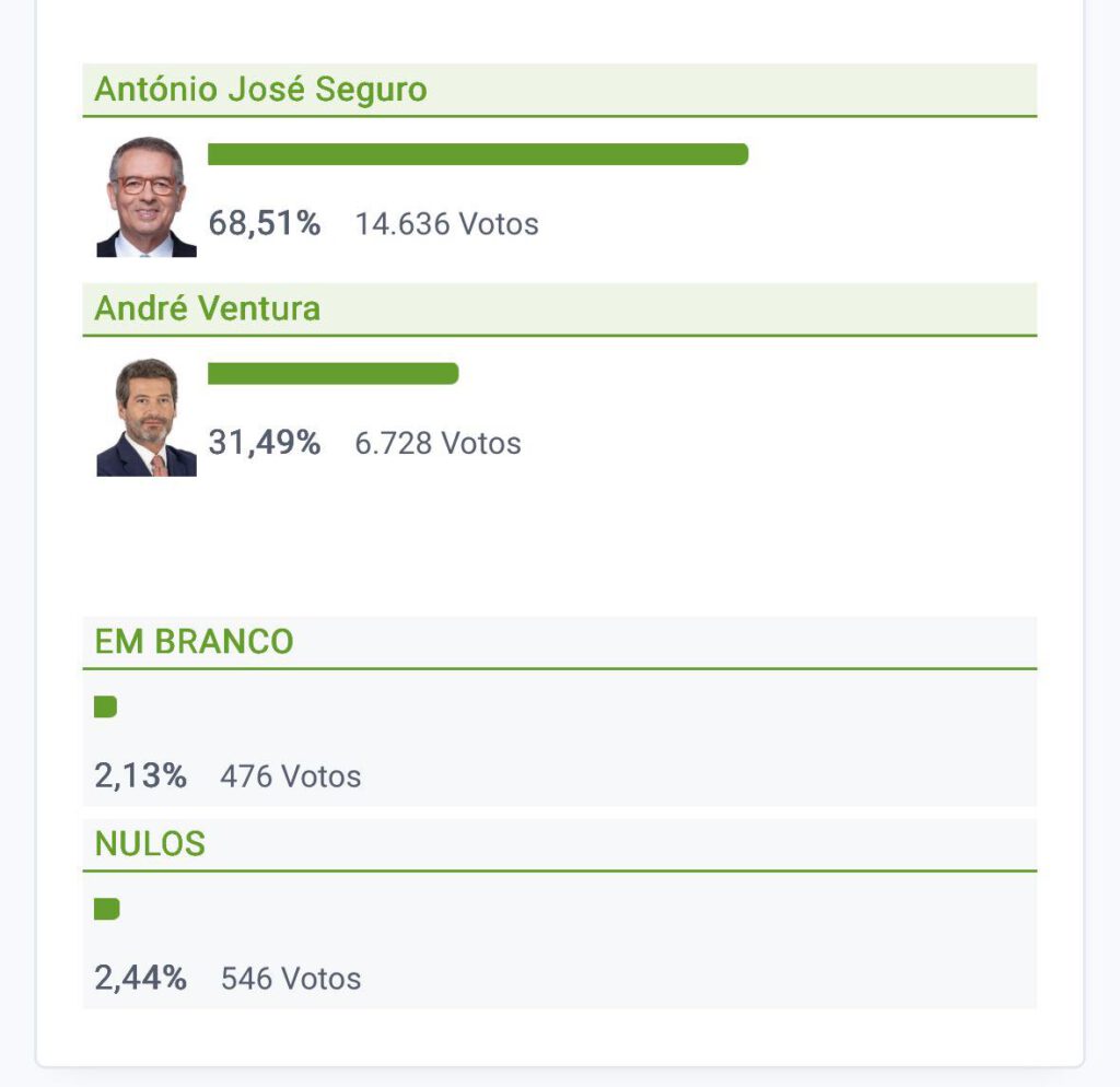 Quando faltam apurar apenas três freguesias no círculo eleitoral da Guarda, António José Seguro tem 65,87% dos votos e André Ventura 34,13%. No concelho da Guarda, os resultados finais indicam que Seguro obteve 68,51% (14.636 votos) e Ventura 31,49% (6.728 votos).