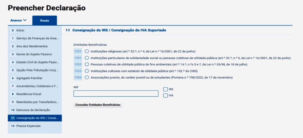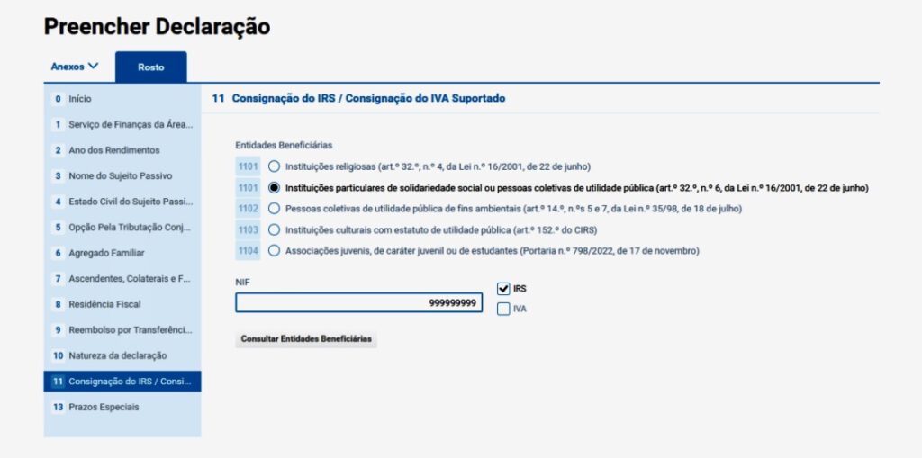 • O que procurar: no menu lateral do formulário, selecione o quadro “11 Consignação do IRS/ Consignação do IVA suportado”