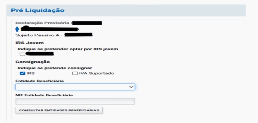 • Inserção do NIF: no campo “NIF”, deve escrever o número de identificação fiscal da entidade escolhida e assinalar o quadrado ao lado que indica “IRS”.