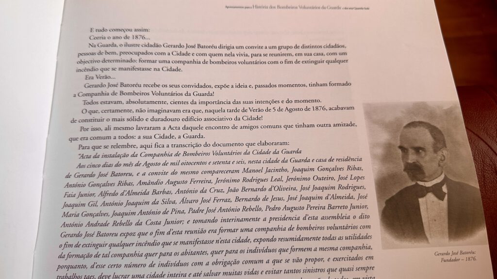 No livro “Apontamentos para a História dos Bombeiros Voluntários da Guarda e dos seus Quartéis-Sede”, Álvaro Guerreiro, ex-presidente da direcção da AHBVE, recorda o surgimento da Associação Humanitária, que remonta a 1856, quando, em resposta a um convite de Gerardo José Batoréu, um grupo de distintos cidadãos reuniram na sua casa e decidiram formar uma companhia de bombeiros voluntários com o fim de extinguir qualquer incêndio que se manifestasse na cidade. O autor do livro adianta que o padre José António Rebello viria a ser escolhido para primeiro presidente da direcção instaladora, cargo que apenas desempenhou por três dias, tendo sido substituído por Francisco da Silva Ribeiro, engenheiro e director das Obras Públicas.