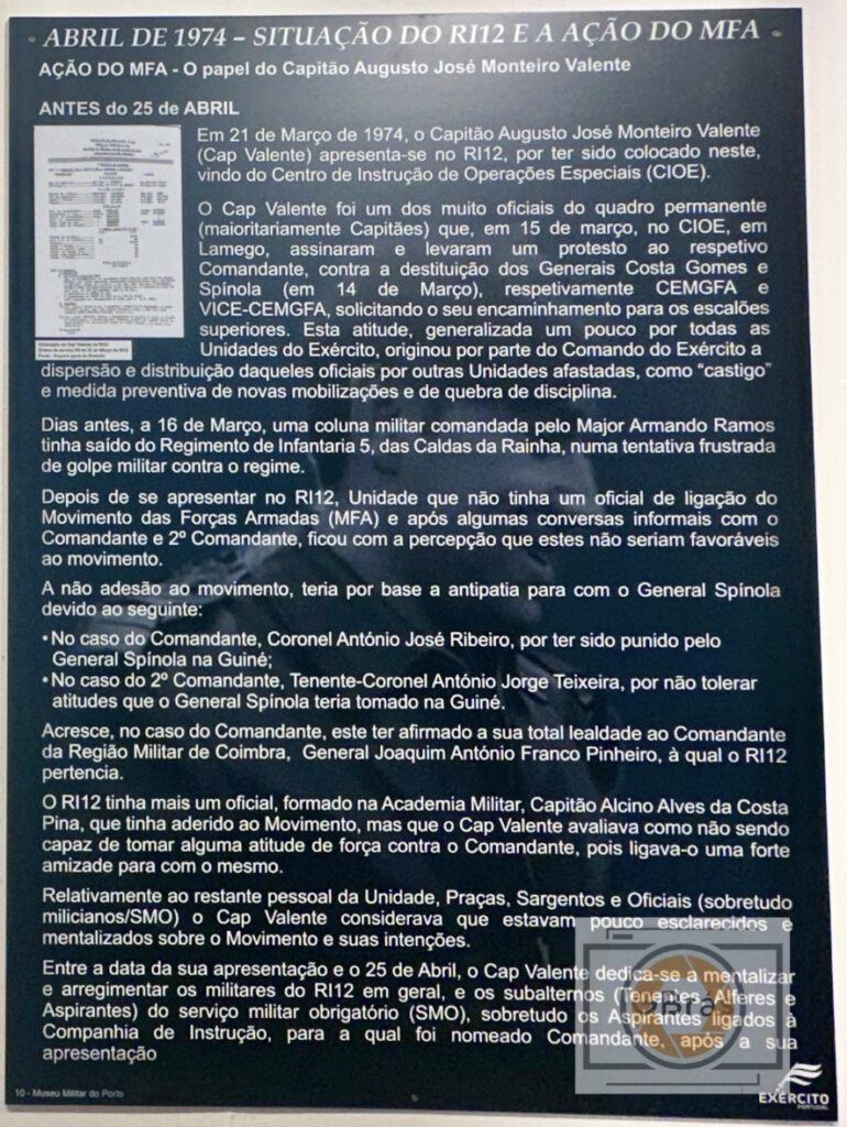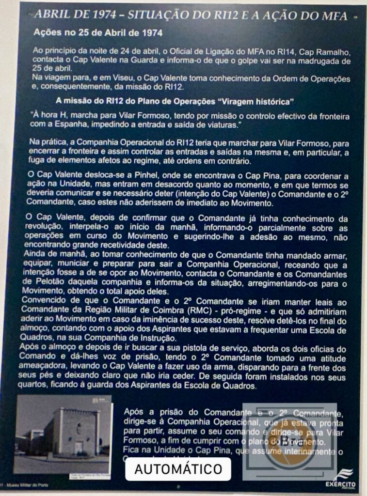 Em 1974, o então capitão Augusto Monteiro Valente comandou uma companhia para fazer a defesa da fronteira em Vilar Formoso e foi ele que deu ordem de prisão às patentes mais altas, que na altura comandavam os militares sediados no quartel militar da Guarda do Regimento de Infantaria 12 (RI12).